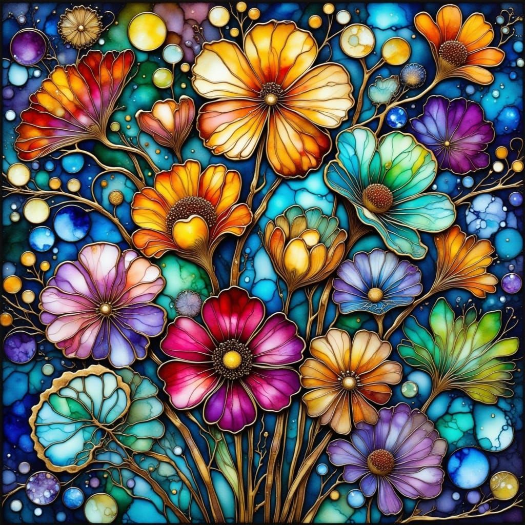 This image shows a vibrant, abstract floral arrangement in a stained glass style, featuring gold and dark blues, with intricate ink splashed filigree and a touch of whimsy.