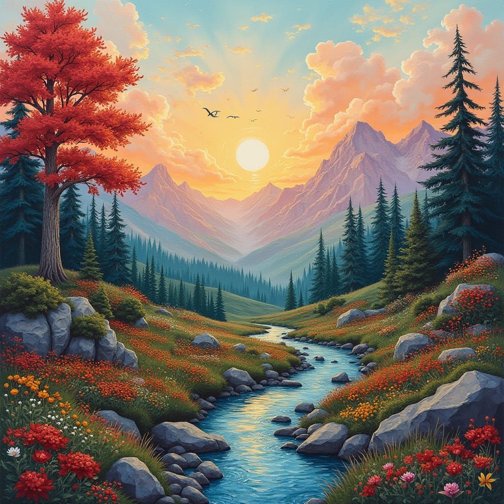 A breathtaking landscape featuring a blend of intarsia, watercolor, and ink techniques. The image showcases patchwork art with rich colors and dynamic lighting, rendered in ultra-detailed 8K resolution.