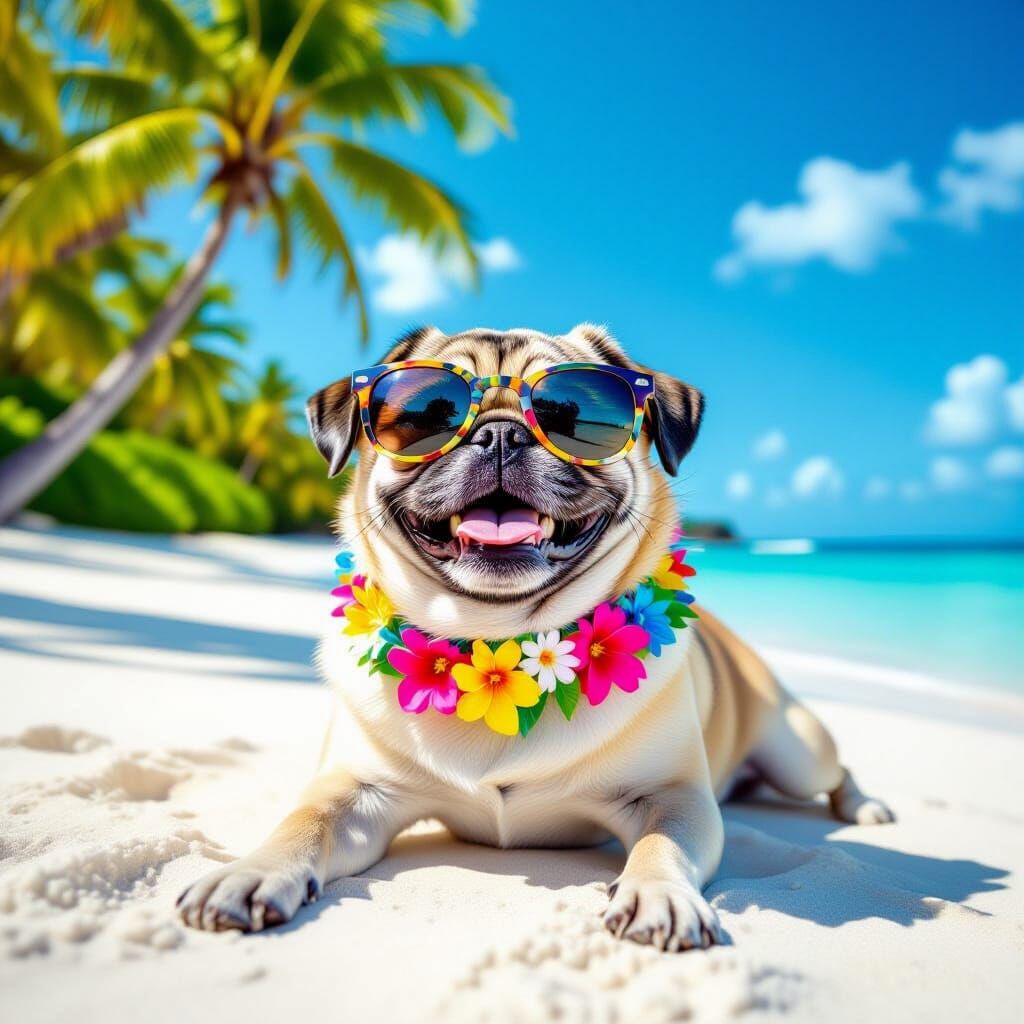 This image shows a pug dog on a tropical beach. The dog wears sunglasses and a floral collar, relaxing on white sand under palm trees, expressing joy in a photorealistic style.