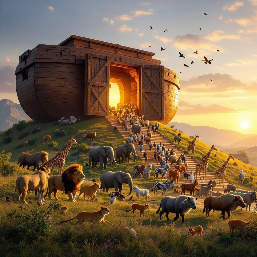 This image shows a colossal wooden Ark atop a hill, its doors open to a vibrant new world. Animals stream forth into a lush landscape under a dramatic sunrise, rendered with photorealistic detail.