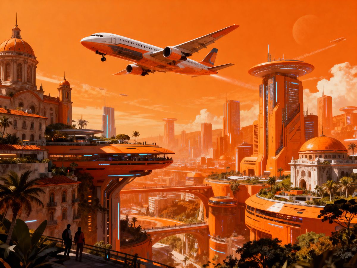 This image showcases a vibrant, retrofuturistic cityscape bathed in orange tones. It depicts a solarpunk utopian vision with sleek, idealistic designs and layered elements.