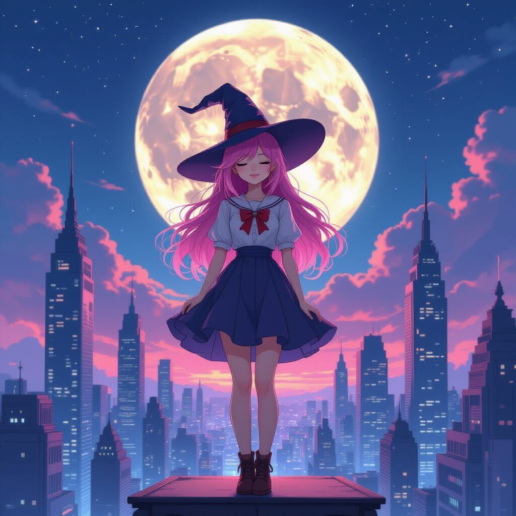 An anime witch with pink hair and a witch hat stands on a board, smiling gently amidst futuristic skyscrapers. A large moon illuminates the night city, rendered in a hyperrealistic, cinematic style with soft colors.