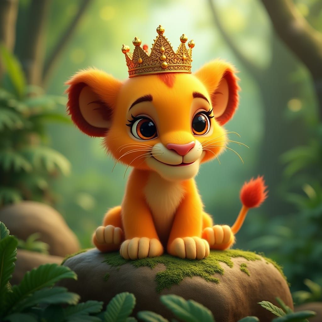 This image shows an adorable baby lion with a golden crown sitting on a rock in a jungle. The vibrant 3D cartoon style resembles Disney-Pixar animation.