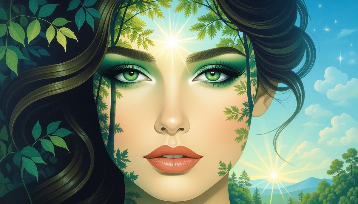 This surreal image blends a woman's face with emerald eyes into a forest and sky landscape. Features a matte oil on canvas texture, reminiscent of Dali's dreamlike art.