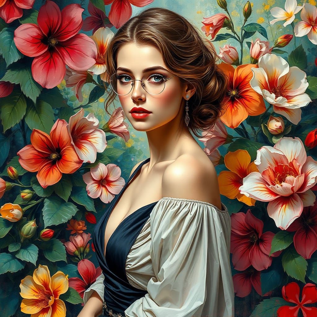 A portrait of a red-haired woman in a blooming garden. The artwork uses impasto techniques and a vibrant triadic color palette to capture dynamic neo-impressionist elements with dramatic lighting.