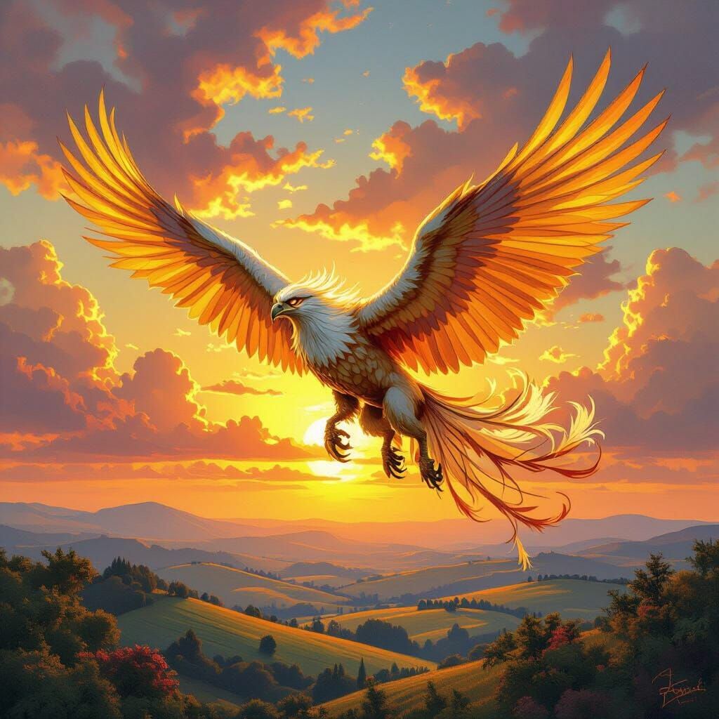 A breathtaking image of a griffin flying over a landscape at sunset. Golden light illuminates rolling hills and ancient forests in a scene reminiscent of fantasy art.