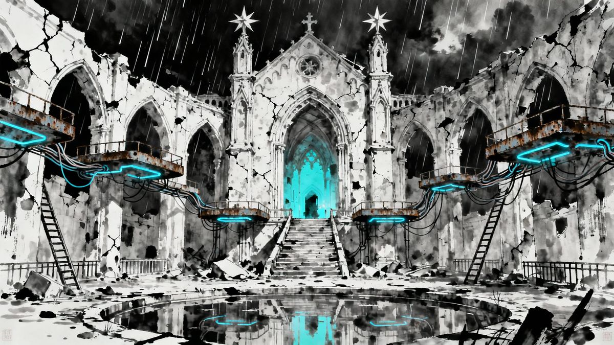 This image showcases a decaying gothic structure in monochrome, featuring intricate arches and star-topped towers. Rusty platforms with blue outlines and a glowing turquoise interior blend technology with ancient architecture under a stormy sky.
