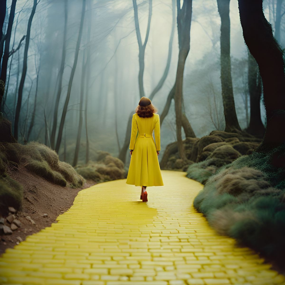 This image captures a dark, horror-themed fashion magazine concept for The Wizard of Oz, featuring a spooky forest and a hint of a yellow brick road with soft focus.