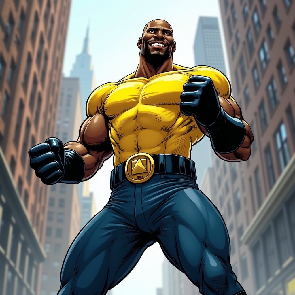 This image shows a muscular African American superhero, inspired by Marvel Comics' Luke Cage, striking a confident boxing pose in a bustling New York City setting.