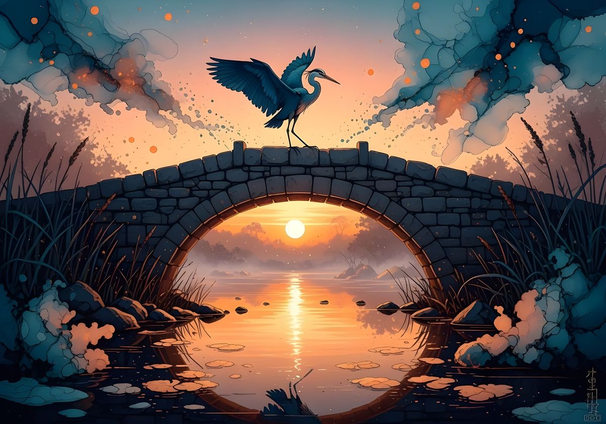 A graceful heron is poised on an old stone bridge at twilight, its silhouette stark against the setting sun. The image features delicate ink feathering and shimmering copper accents.