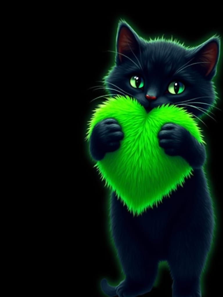 This enchanting image features a stunning woman with piercing sapphire eyes, cradling a playful black cat amidst a luminous green moonlit scene, with delicate textures and whimsical details reminiscent of dreamy digital paintings and faerie art.