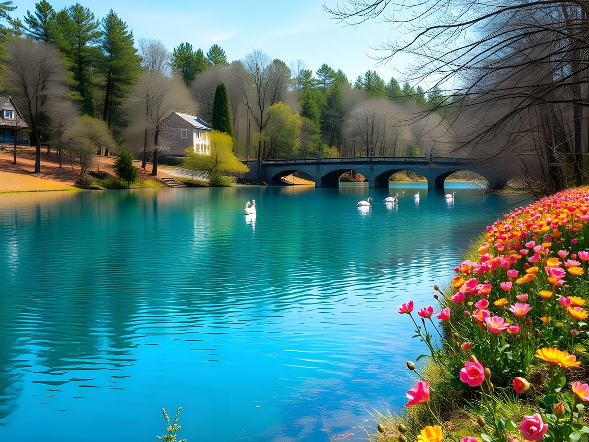 This serene image captures the beginning of spring with blooming flowers along a tranquil forest lake, a picturesque bridge, and wildlife in a stunning display of natural beauty, all captured with professional photography techniques and sharp focus.