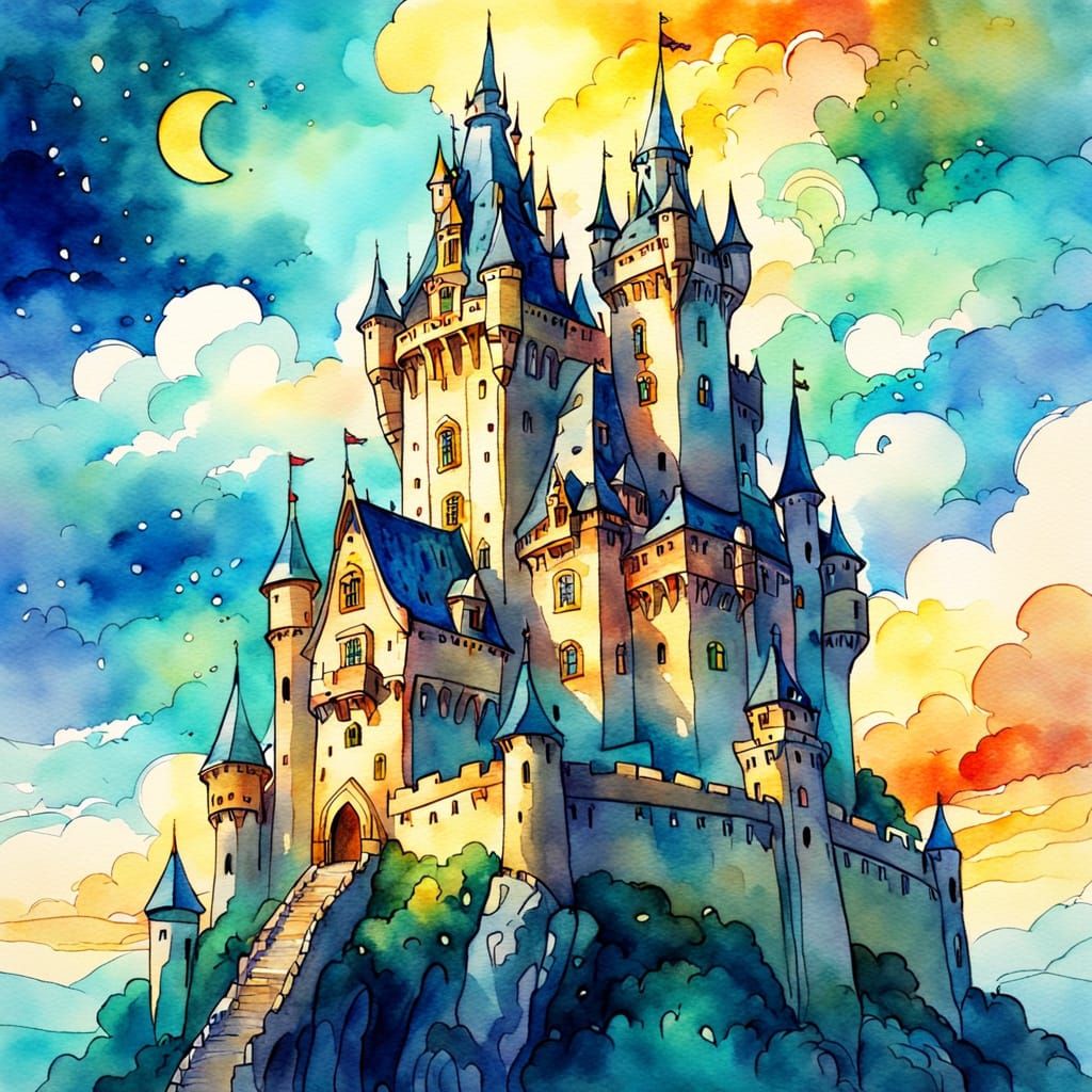This enchanting watercolor painting features a majestic, intricately detailed castle floating in the sky, bathed in warm golden light and rendered in a vibrant, soft-brushstrokes fauvist style.