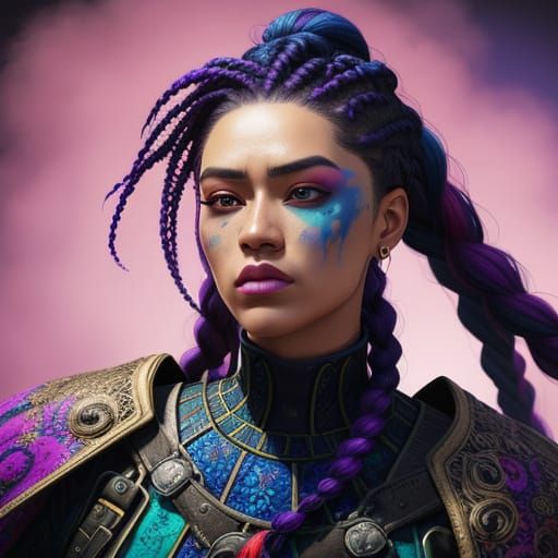 This image shows a woman with colorful braided hair in a splash art style. The digital painting features intricate textures, dramatic lighting, and a blurred background to create a vivid, realistic effect.