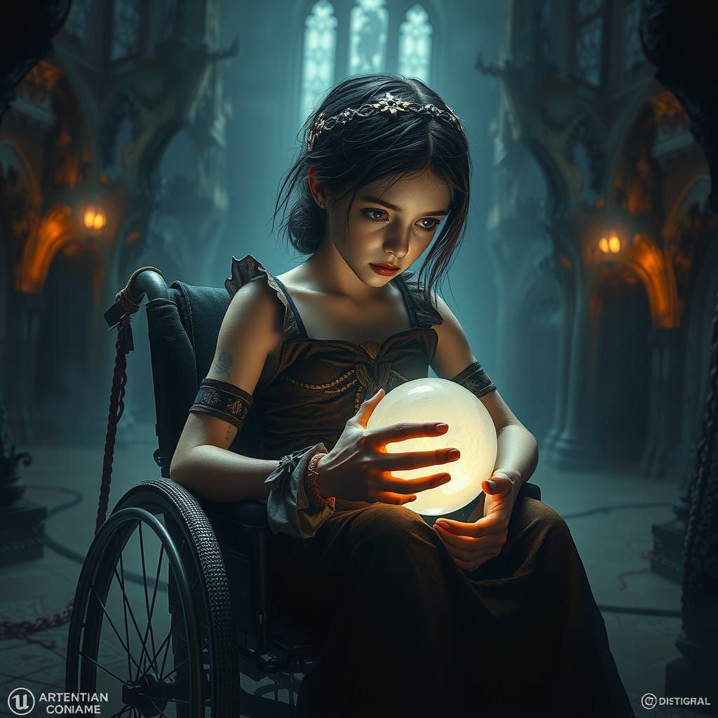 This haunting image depicts a wheelchair-bound young woman intensely gazing at a glowing crystal ball, surrounded by ominous shadows and twisted gothic architecture, in a richly colored, Lovecraftian-inspired scene that exudes foreboding and unease, reminiscent of dark fantasy concept art.