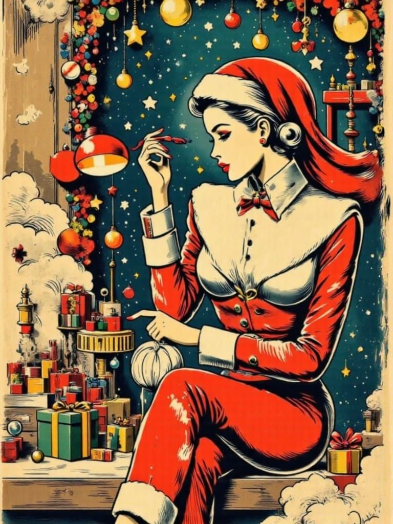 Easily generate your own vintage-style Santa Claus images and mid-century modern Christmas scenes for free.