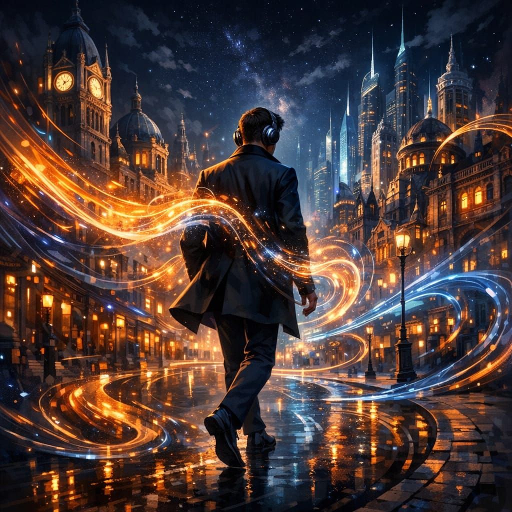 A man in a black coat walks through a surreal night city, headphones on. Sound waves morph buildings into a fusion of old and futuristic architecture, lit by neon.