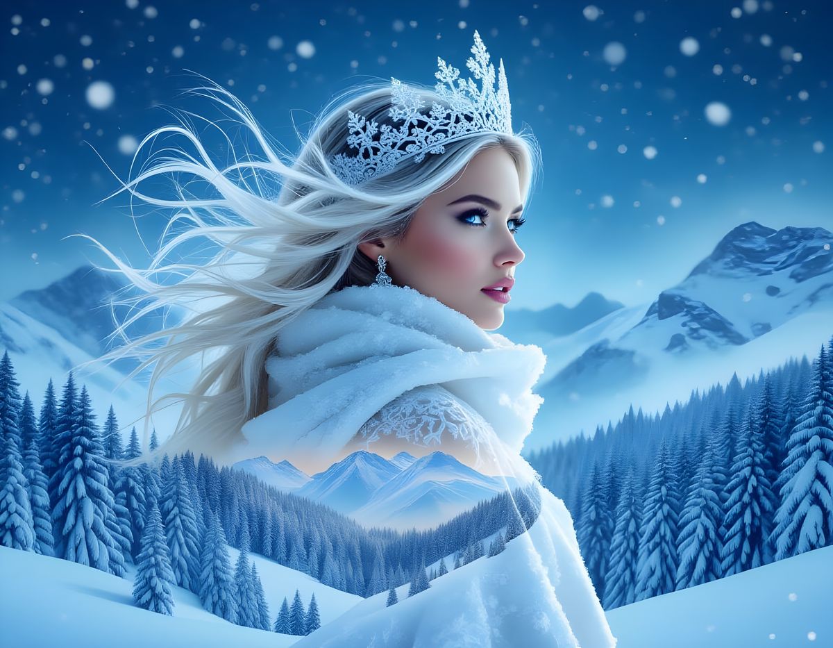 This image captures a serene winter scene with a woman whose hair blends into a snowy landscape of fir trees, featuring swirling snowflakes and a city in the background.