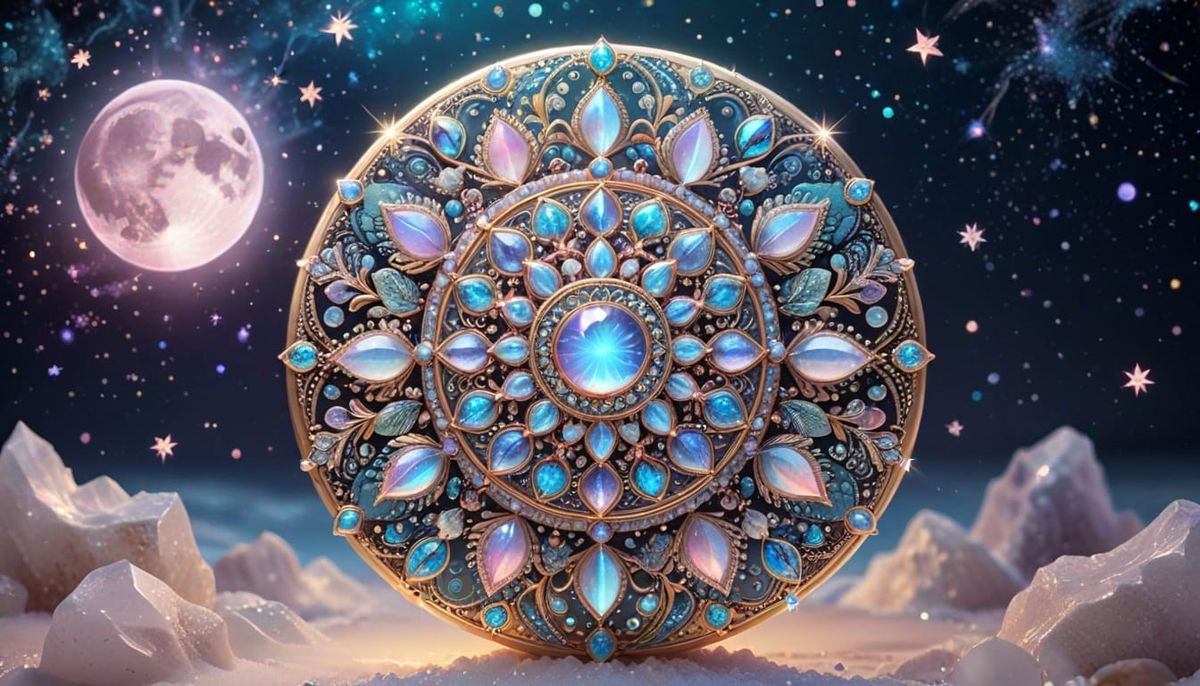 "high quality mandalas, magical Full Moon, extreme pastel colors, Iridescence mystical bejeweled moonstone, cute, kawaii, perfect, legendary...