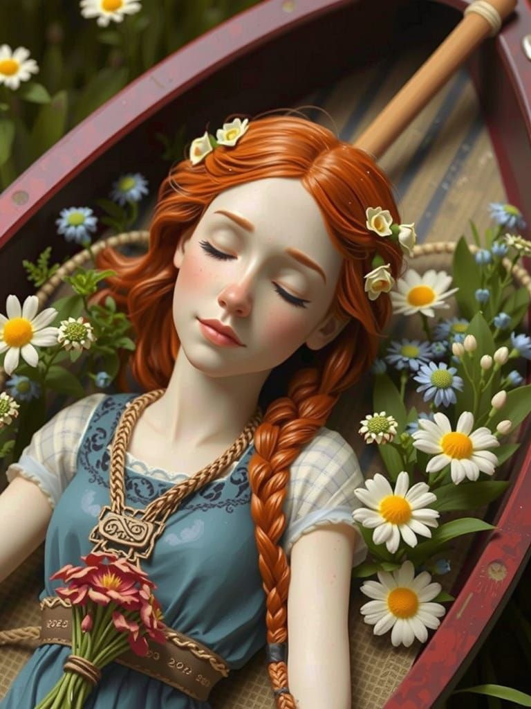 This image shows a red-haired girl in a canoe, adorned with flowers and lace. The picture is reminiscent of 1920's Art Deco, presented as Pixar-inspired 3D digital art.