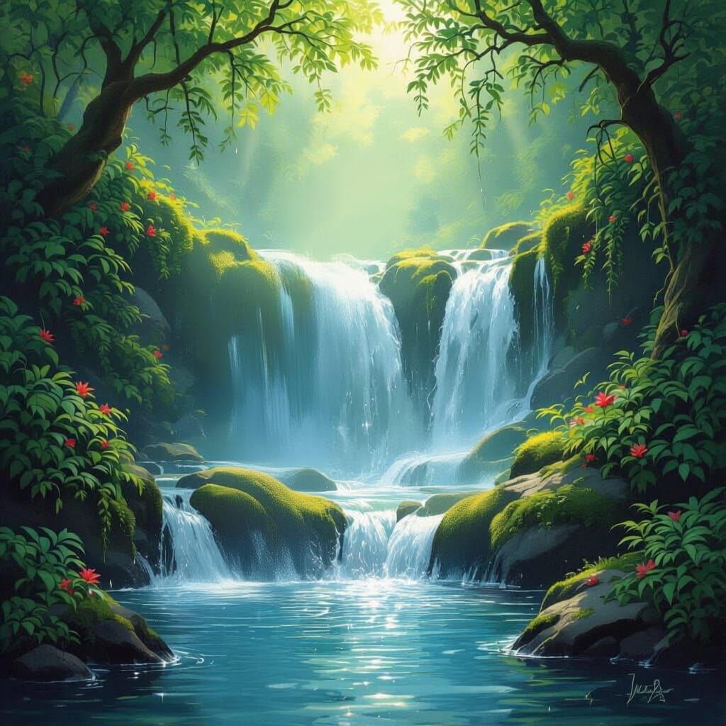 This oil painting depicts enchanting harp and violin instruments beside a vibrant, mossy waterfall. Dappled sunlight illuminates lush greenery, showcasing painterly textures and atmospheric depth.