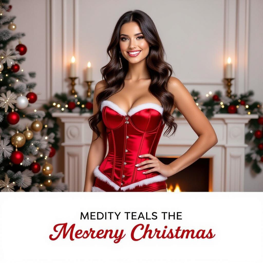 This image features a beautiful woman with dark hair, dressed in a festive satin Christmas corset, posing near holiday decorations. The scene evokes a warm, celebratory atmosphere.