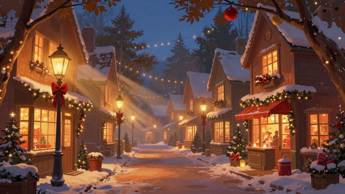 This image depicts a cozy Christmas village street scene with decorated houses, warm lights, and festive ornaments. Rendered in a painterly fantasy concept art style with rich, warm hues and ethereal lighting.