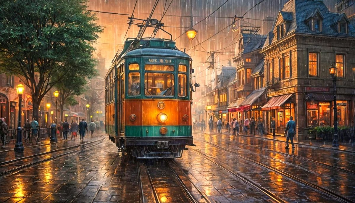 This image shows a vintage tram on rain-slicked tracks amidst charming buildings. Streetlights cast a glow on the wet streets, creating a nostalgic and detailed scene in a Thomas Kinkade style.