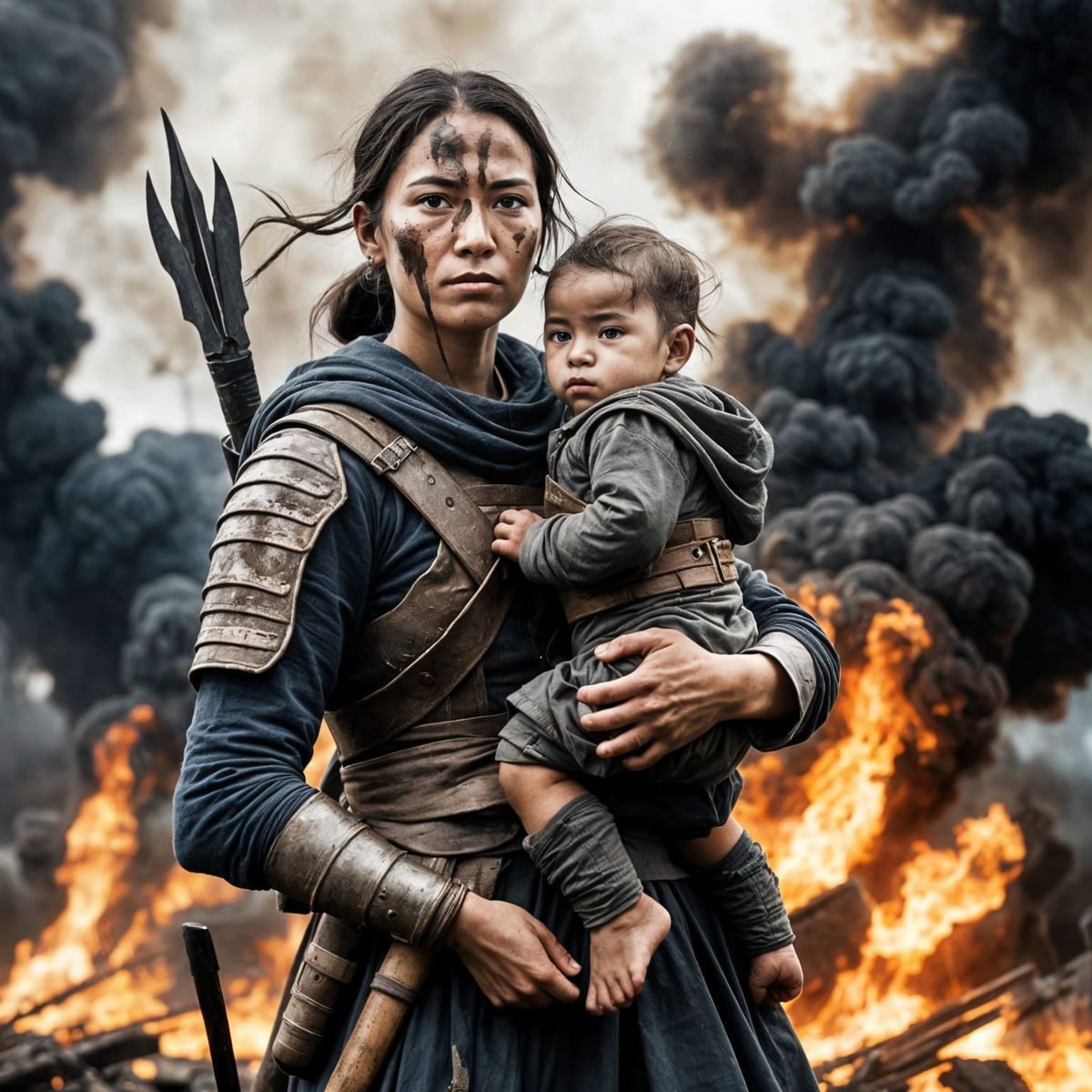 This image depicts a powerful warrior mother navigating war-torn terrain, her child secure in her arms. Expressionist brushstrokes evoke the turmoil of battle, as ash and flames engulf the ravaged earth.