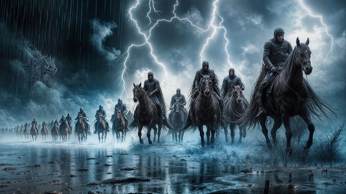 This image shows storm riders in a cinematic scene. The image is detailed and atmospheric, with film grain and dramatic lighting. The aesthetic is reminiscent of dark oil paintings.