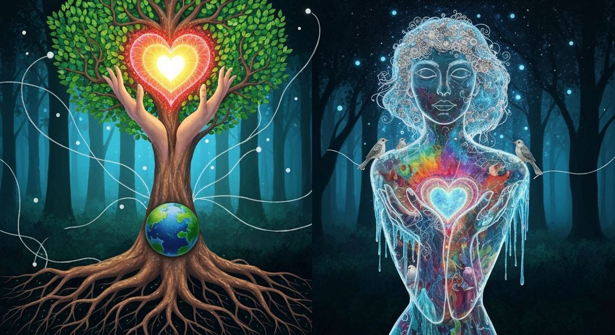 This image shows a mystical being emerging from a forest, with roots and branches, crafted from translucent dots and energy lines, featuring nurturing hands and a bioluminescent oasis within.
