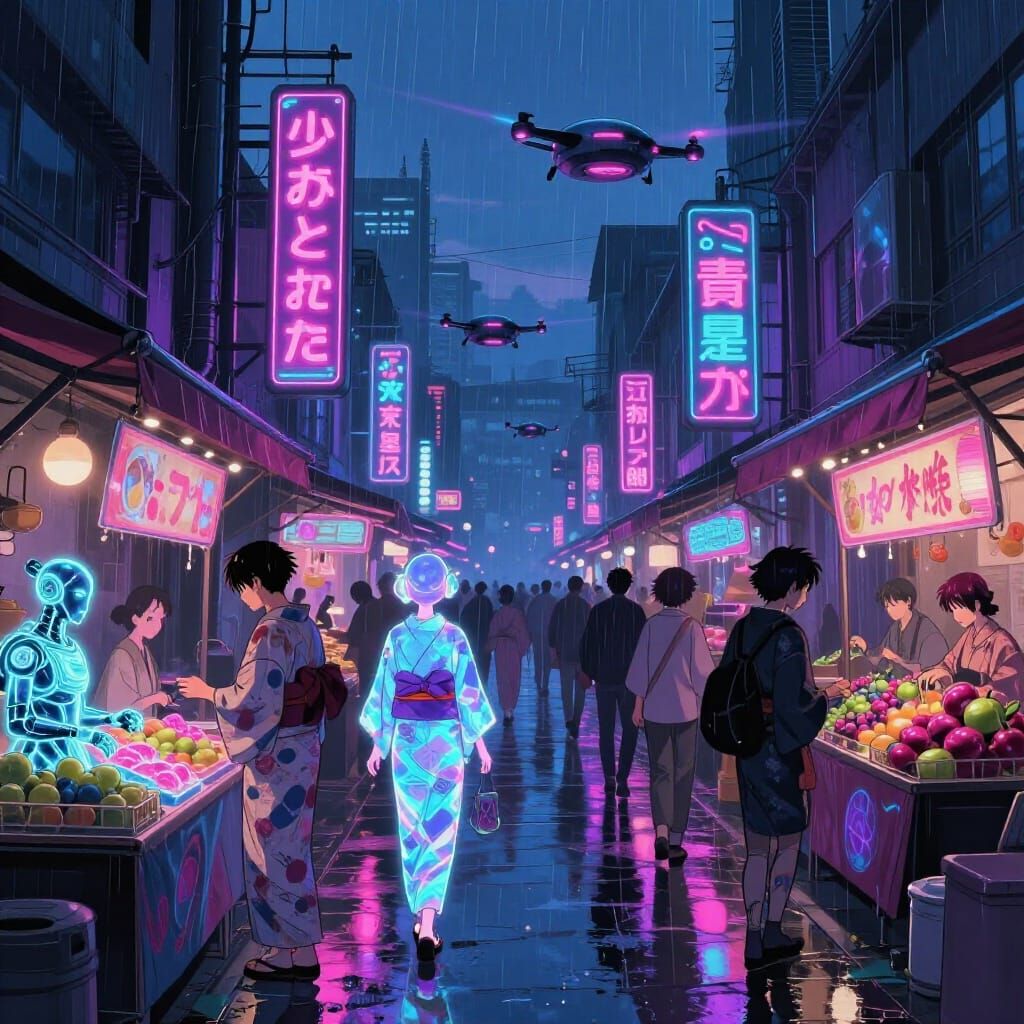 This image depicts a busy cyberpunk market at dusk, illuminated by neon signs. Shoppers in holographic kimonos explore stalls in a detailed anime style, featuring dramatic lighting and vibrant colors.