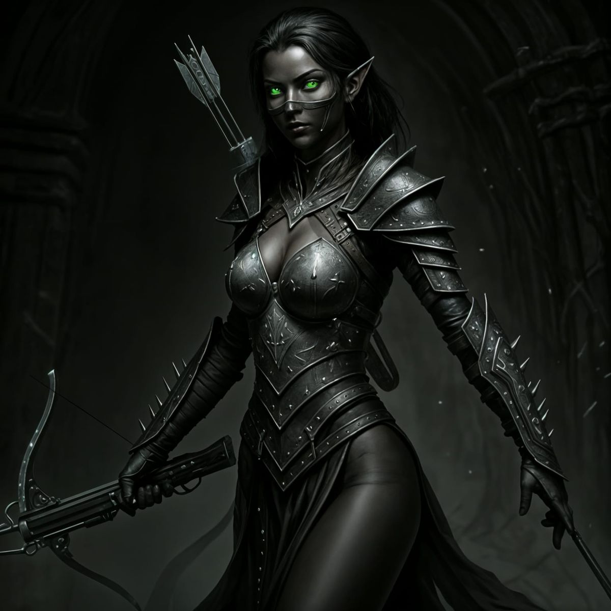 A striking picture of a dark elf warrior woman in spiked leather armor. She is masked and armed with whips and a crossbow, ready for battle with glowing eyes.