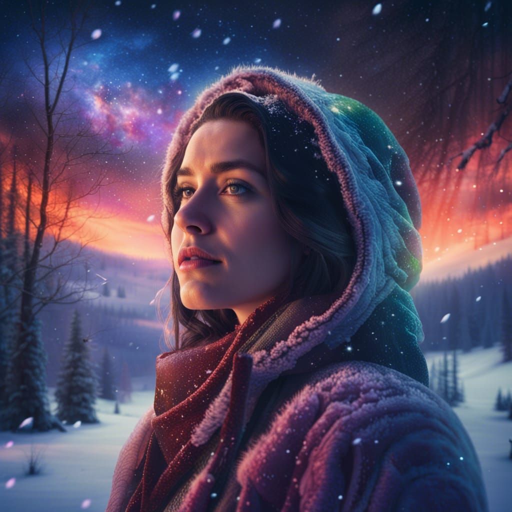 A cinematic portrait of a woman in a snowy forest. A multicolored galaxy sunset creates a dramatic and detailed backdrop in this digital matte painting.