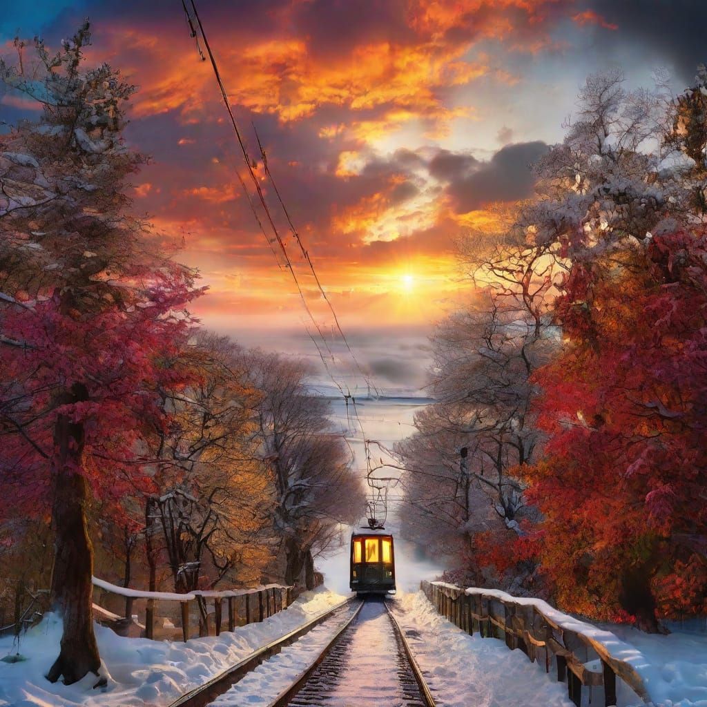 This image showcases a majestic, hyperdetailed winter cityscape with trams crossing a bridge under a dark red sunset. The art style blends alcohol ink with impasto, creating a moody, dreamlike masterpiece.