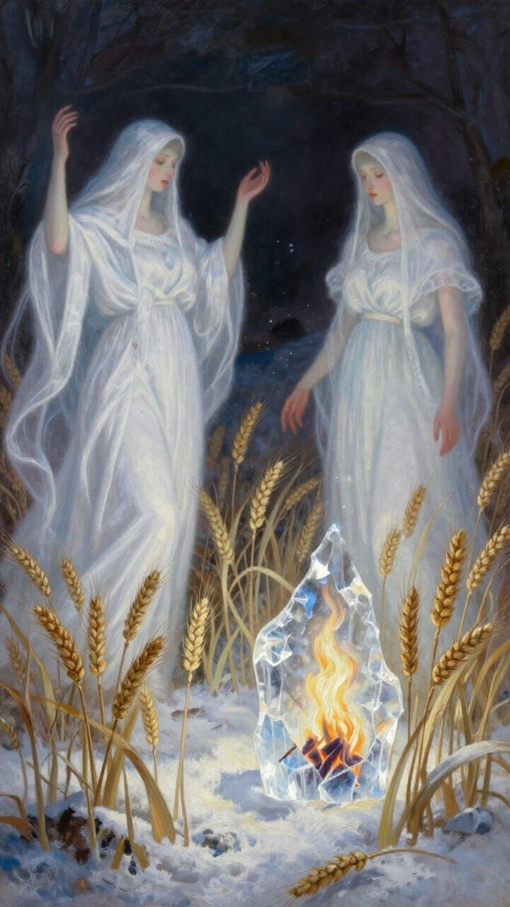 This image depicts a surreal Slavic winter ritual with glowing snow and floating linen spirits. Fire is encased in ice, creating a mystical folklore scene with dramatic lighting and an ethereal atmosphere.
