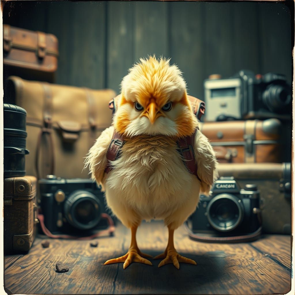 This image shows a fluffy chick with a tiny backpack, standing on a wooden floor. Vintage luggage and cameras surround it as it looks at the camera with a grumpy expression in a retro polaroid style.