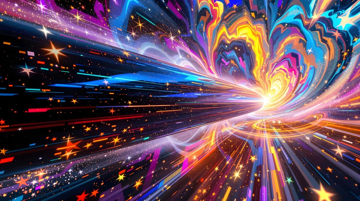 A macro shot of a smooth black cylinder speeding through a vortex of colorful plasma and stars. The vivid colors and expressive brushstrokes evoke unbounded motion.