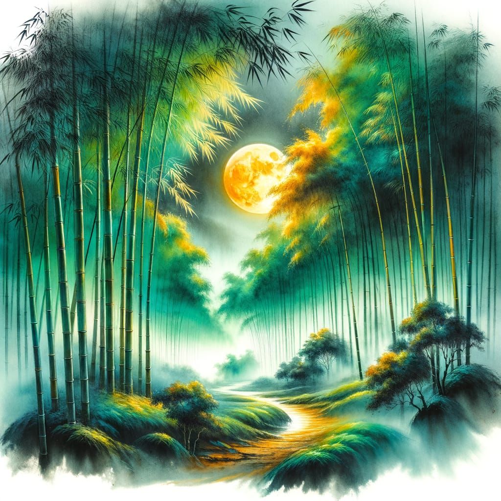 This image showcases a serene bamboo forest rendered in traditional Chinese watercolor. It features vibrant green bamboo, a winding path, and a golden moon through mist, highlighted by dynamic brushstrokes.