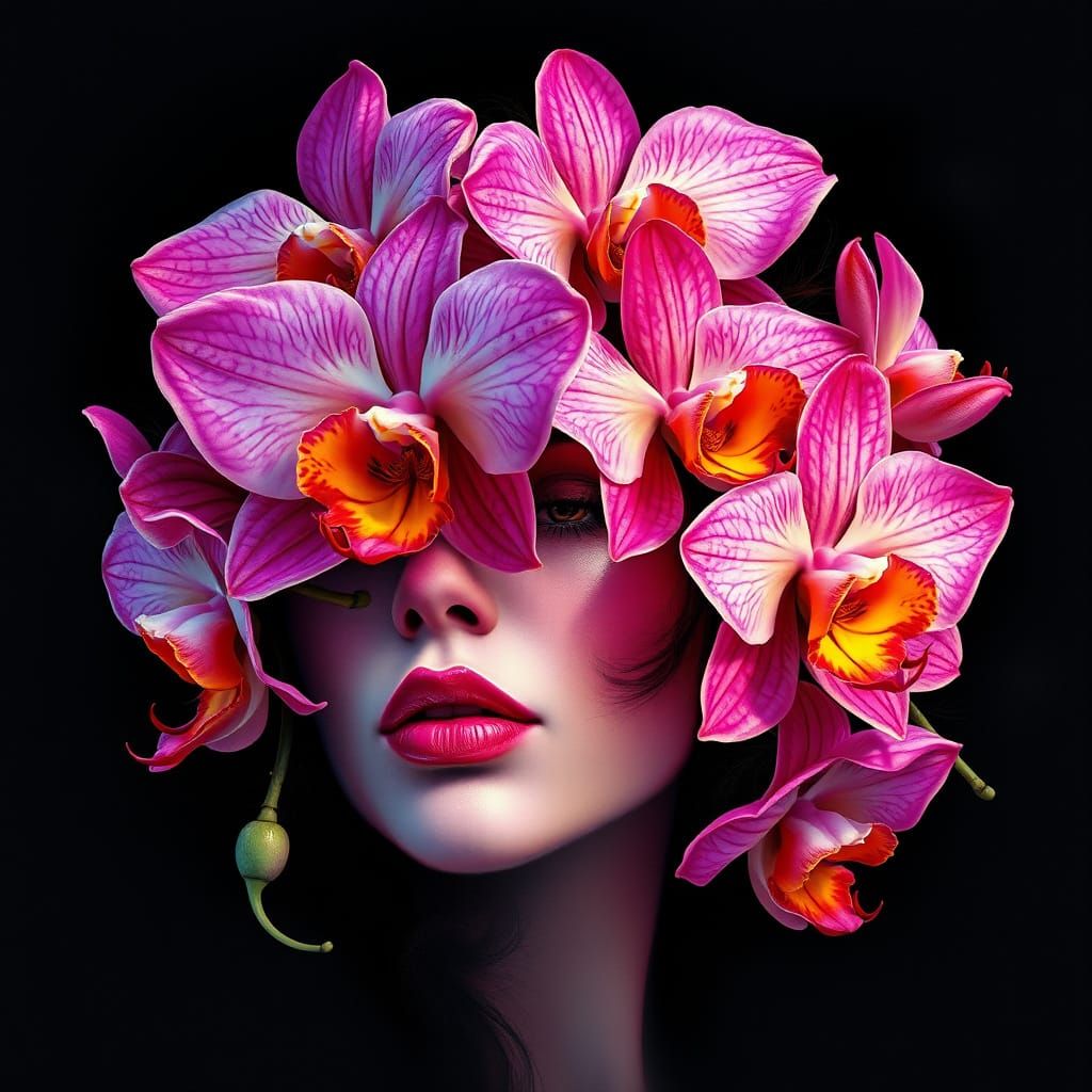A stunning, hyperrealistic portrait of a woman's face adorned with vibrant orchids, set against a dark watercolor background, blending fantasy realism with art nouveau flair.