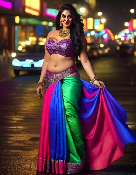 This image shows a curvy woman in a glittery rainbow saree standing in a neon city at night. The full body shot focuses on her back view, emphasizing her slim waist and long hair.