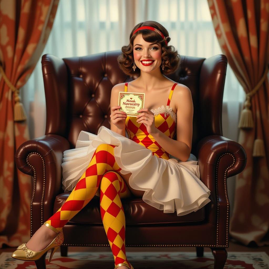 A digital painting of a brunette woman in harlequin tights and tutu, seated on a leather chair. She holds a vintage postcard, evoking a 1920s flapper style with intricate details and complementary colors.