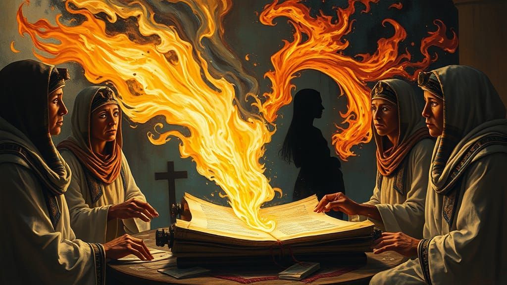 This haunting image depicts ancient Egyptian scribes in a state of despair as a papyrus scroll is consumed by swirling, otherworldly flames. The atmosphere is heavy with forgotten memories, evoking a sense of time's erasure and the weight of lost history.