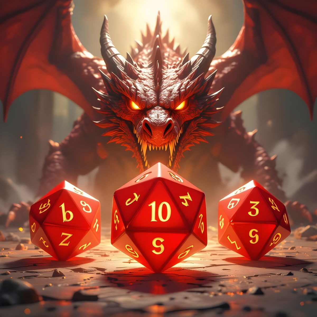 This image features three cartoon-style flaming D20 dice, with a large one in the center flanked by smaller ones. A red dragon head looms ominously from behind.