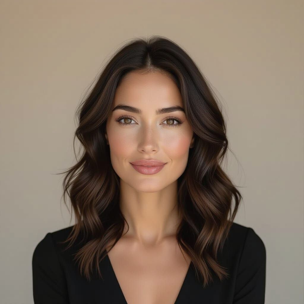 This image showcases a photorealistic portrait of a woman in her late 30s. It features soft lighting, detailed skin texture, and a gentle smile, captured with an 85mm lens.