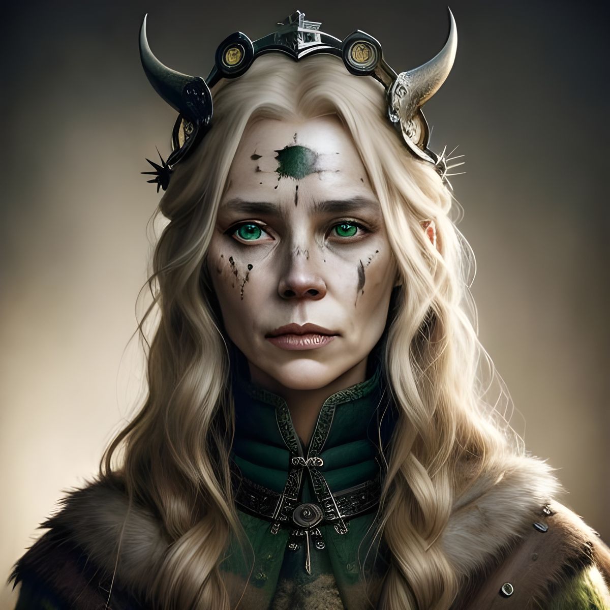 This image shows a hyperdetailed portrait of a 60-year-old Viking Queen with scarred, weathered skin and sharp features. The artwork employs realistic shading and fine details.