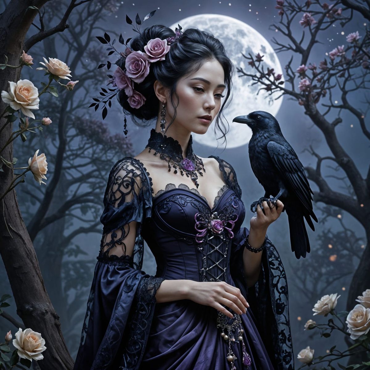 This hyper-detailed digital painting features an elegant East Asian woman in a dark corset gown under a full moon, with a raven on her hand. The scene is mysterious and romantic with misty trees and blossoms.