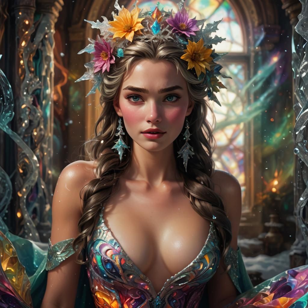 A vibrant digital artwork of Elsa in an icy landscape. The piece features swirling patterns, fractals, and a color gradient reminiscent of the Northern Lights, rendered in a psychedelic style.