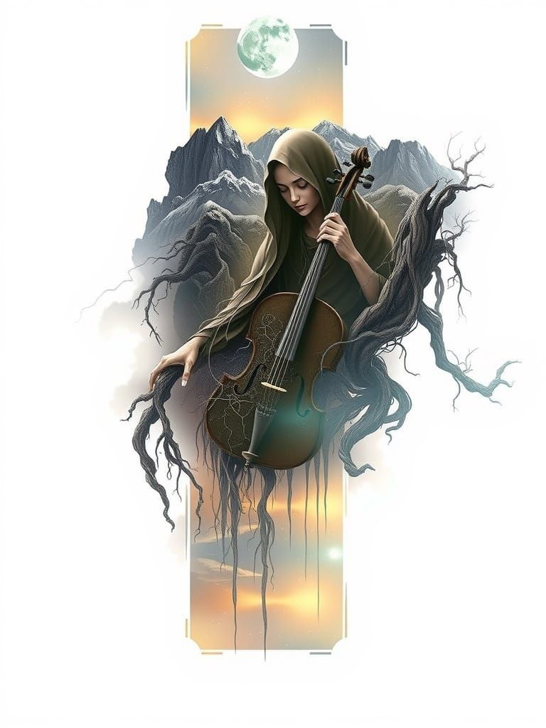 This striking image depicts a majestic mountain range with a mystical celestial sky above, surrounded by a crystal lake and intricate root systems. A veiled goddess is subtly integrated into the mountains, her presence marked by gentle tears and a haunting cello-like instrument crafted from roots. The ar...