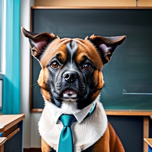 This image shows a dog dressed as a teacher in a classroom setting. The digital portrait features bright, cartoonish colors, warm lighting, and a soft focus to enhance its playful and educational theme.